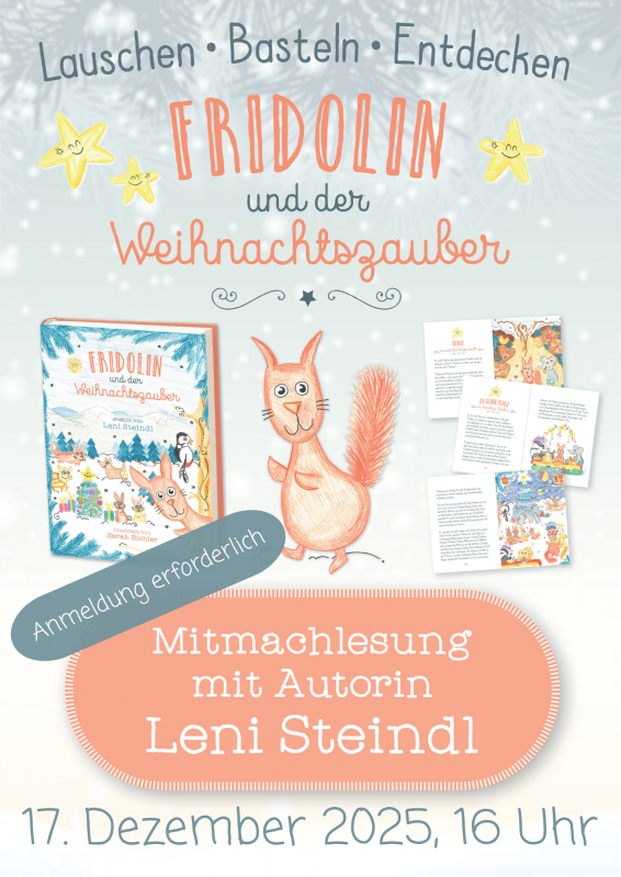 Das neugierige Eichhörnchen Fridolin ist wirklich ein Weihnachtsanfänger… Bei einer bunten Mitmachlesung nimmt euch Autorin Leni Steindl mit in den zauberhaften Wunderwald. Wir lauschen Geschichten aus „Fridolin und der Weihnachtszauber“ und entdecken die schönste Zeit des Jahres mit allen Sinnen. Datum: 17.12. - 16:00 Uhr |